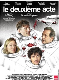 Le Deuxième Acte repose sur un quatuor fort en caractère. Florence (Léa Seydoux) présente à son père (Vincent Lindon) l’homme qu’elle aime David (Louis Garrel). Mais le jeune homme lui n’a pas les mêmes sentiments pour Florence et essaie de la mettre dans les bras de son ami Willy (Raphaël Quenard).